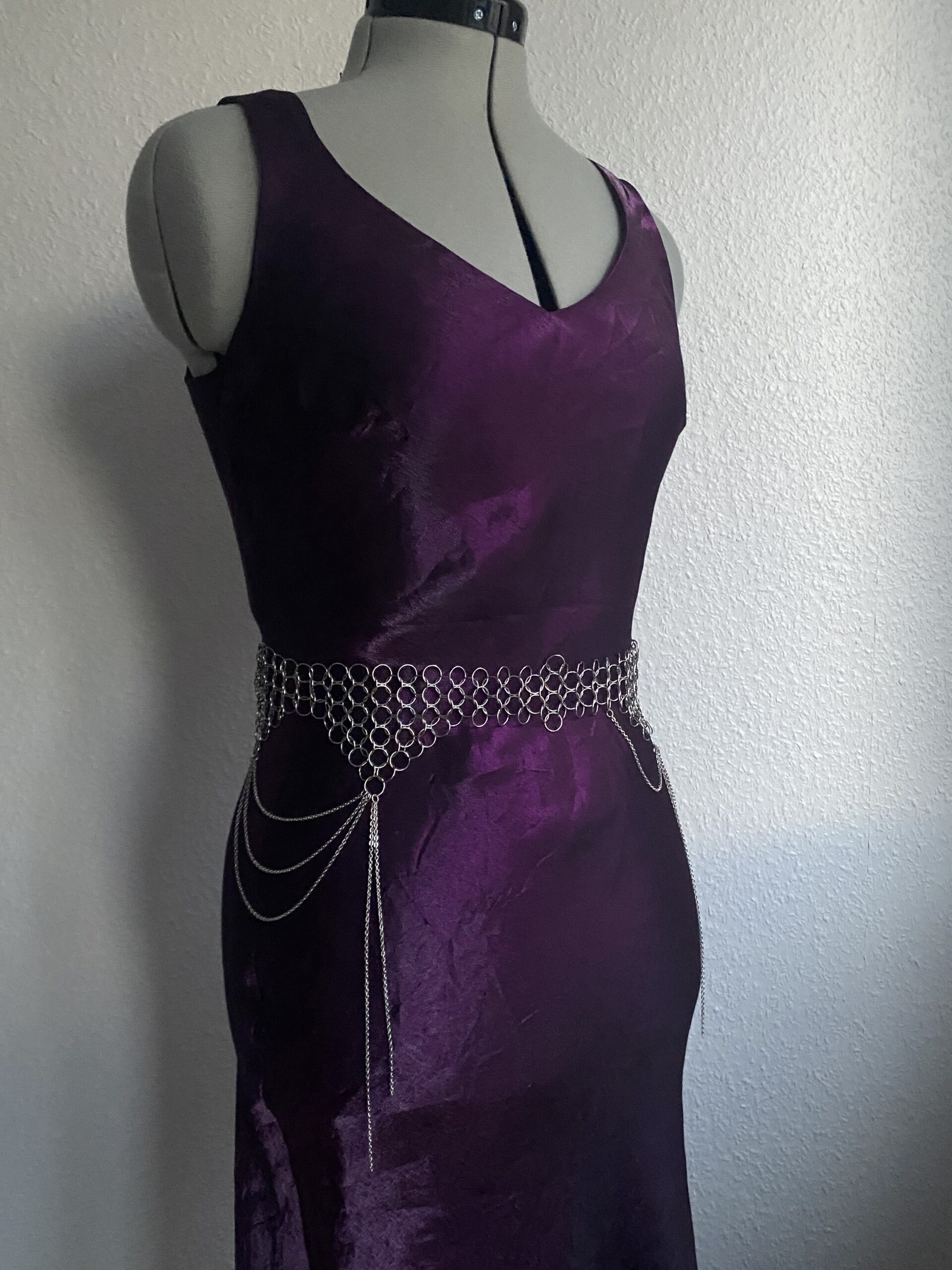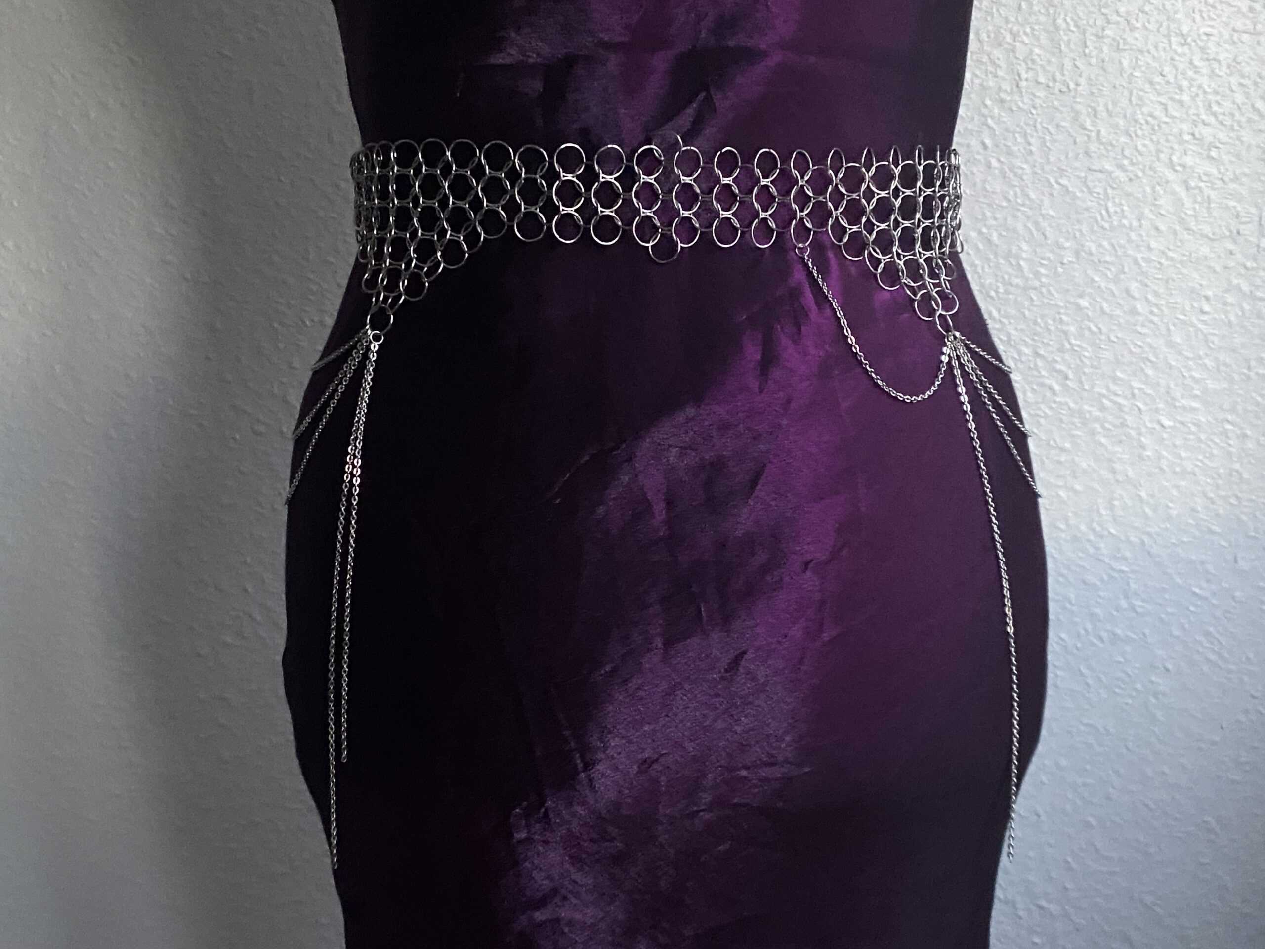 Description: Ceinture en cotte de maille assemblée à la main et ornée de chaînes décoratives. Elle se ferme à l’aide d’un mousqueton dans le dos.